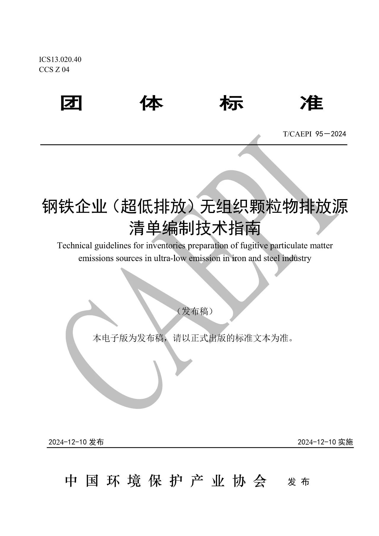 《钢铁企业(超低排放)无组织颗粒物排放源清单编制技术指南》T/CAEPI 95—2024
