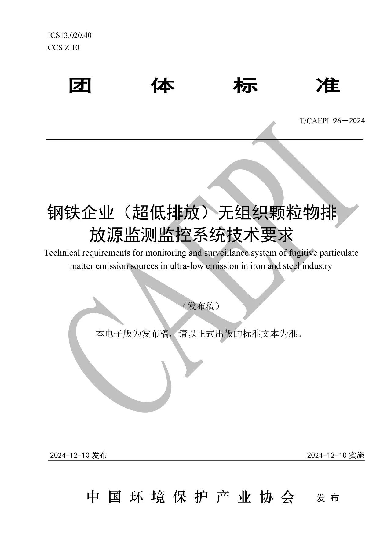 《钢铁企业(超低排放)无组织颗粒物排放源监测监控系统技术要求》T/CAEPI 96—2024